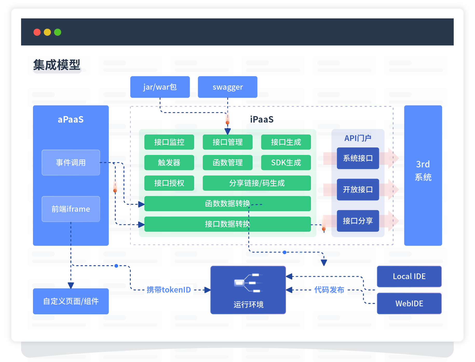 集成模型包括平台本身前、、、、、、、、、、后端能力的扩展,,,,,,,,,,,也支持通过API门户和第三方系统进行交互。。。。