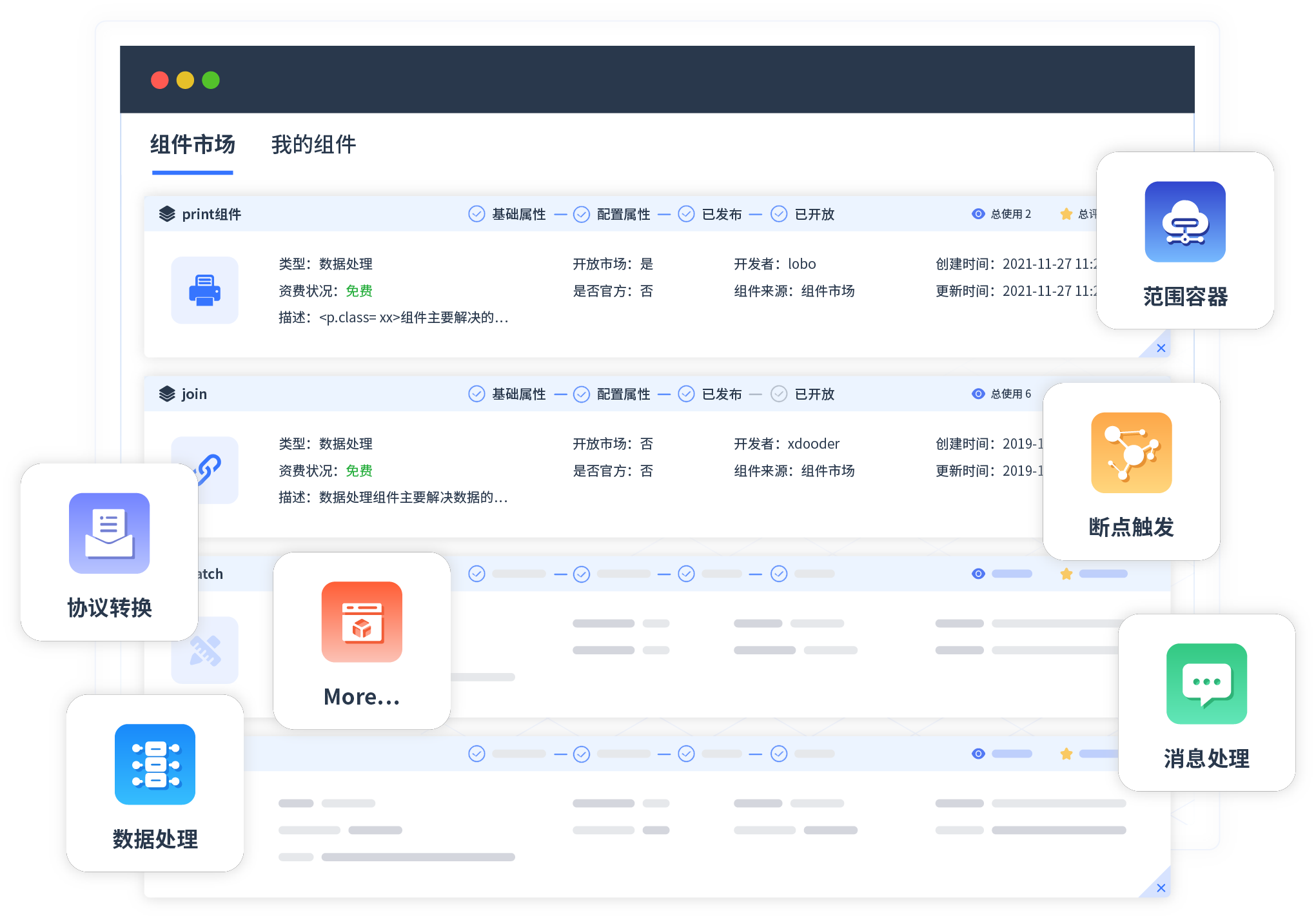 针对集成场景,,,,,,OPPO钱包提供组件市场,,,,,,,,例如协议转换、、、、、、、、、、、、、、消息处理、、、、、、、、、、、、、文件操作等。。。。。。。。。。。。。除平台提供的组件外,,,,,,,客户可以自定义所需组件。。。。。。