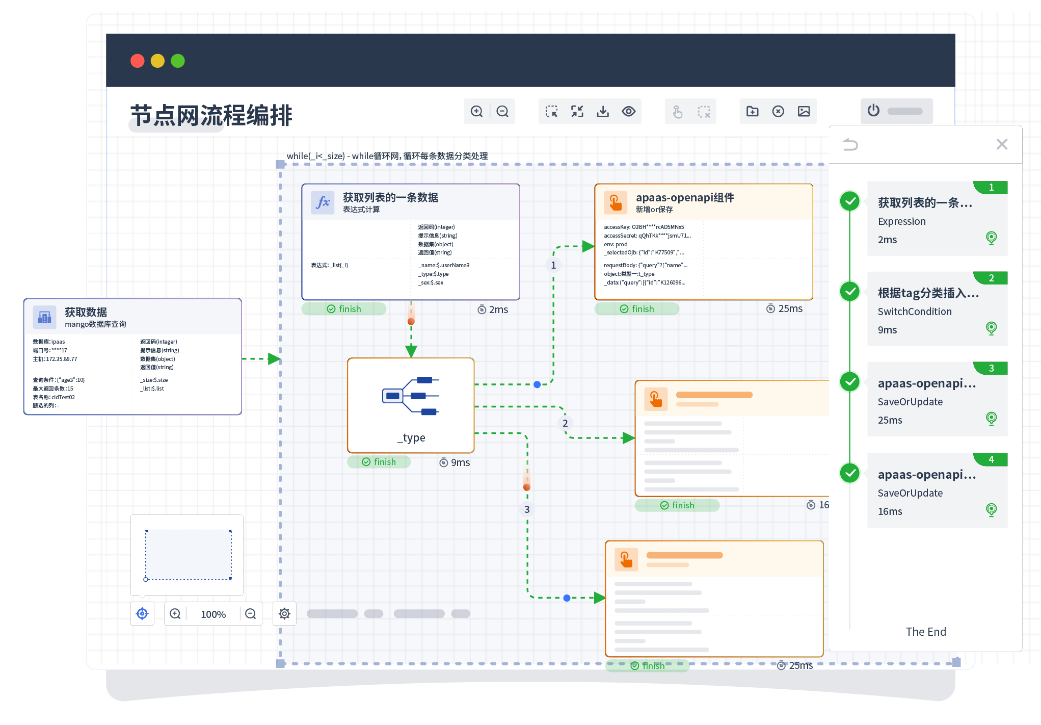 针对集成场景,,,,,,,,组件定义后支持进行流程编制,,,,不同于传统代码方式,,,,,,,,,,,,,通过图形化展示,,,,,,,,,,,,,,支持在线调试、、、、、、、、、日志查看和运行回放。。。。。。。。。。。。。