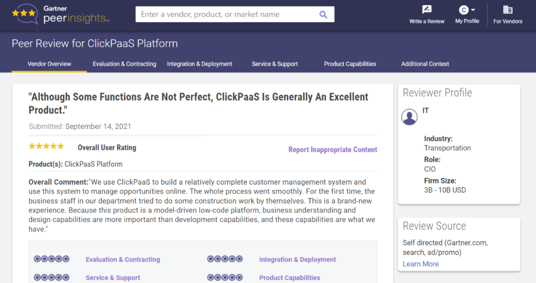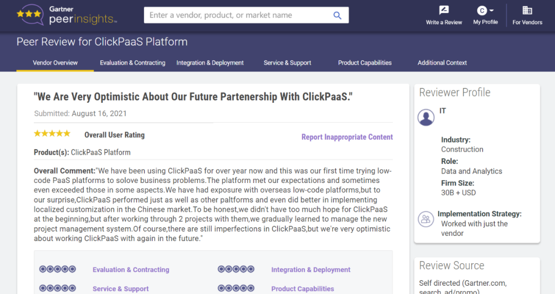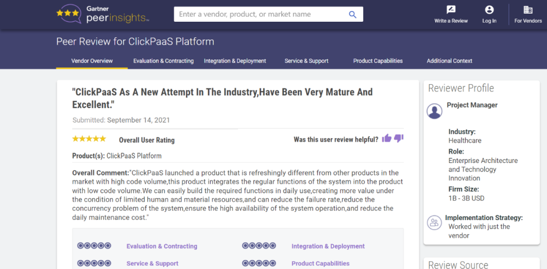 Tips:::::::::【Peer Insights】——用户对企业IT产品和服务发布真实评价的平台。。。。。。。。。。。。目前已有355个市场,,,,,,,,,,255,000条经过验证的评价。。。。。。。。。。。。每一条评价Gartner会针对参评企业营收规模及参评人员信息做验证、、、、、、、、、、评价内容做多维核实。。。。。